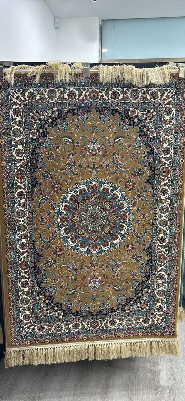 Bring timeless Persian elegance into your home with the Golden Tabriz Medallion Rug, inspired by classic Iranian carpet artistry. Featuring an intricate central medallion surrounded by detailed floral motifs and a rich golden field, this rug blends traditional design with a warm, luxurious colour palette that instantly elevates any living space.