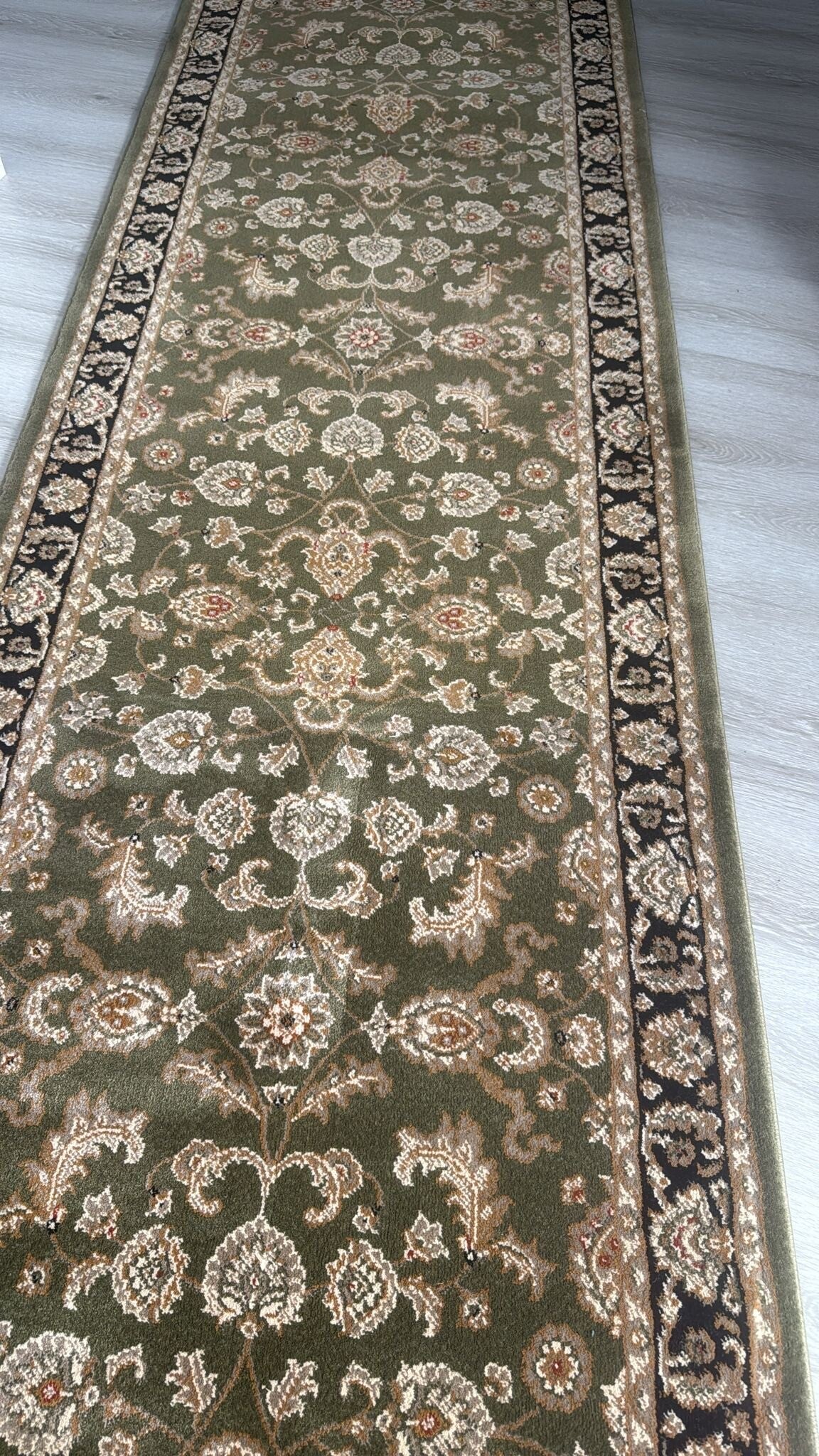 The Verdant Isfahan Runner showcases timeless Persian elegance with its intricate floral vine motifs set against a rich olive-green field and framed by a classic contrasting border. Inspired by traditional Iranian rug artistry, the detailed all-over floral design reflects the heritage patterns commonly found in Persian carpets, where repeating botanical motifs create a balanced and elegant composition.